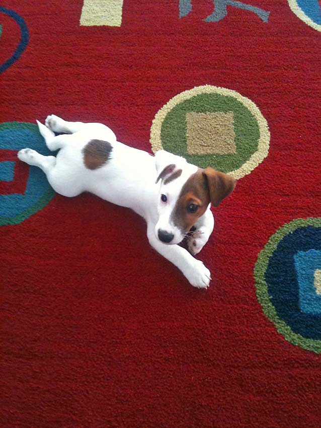 Nosso cãozinho da raça Jack Russell, Jimmy Hendrix, relaxa no tapete que criei em 1987 para a exposição “13 Tapetes Ocidentais” na Paulo Figueiredo Galeria de Arte em São Paulo.