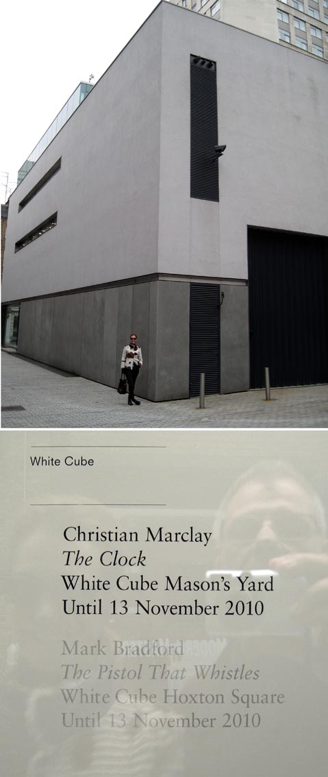 Sandra em frente à White Cube Gallery em Londres, onde assistimos ao filme “The Clock” de Christian Marclay, em uma sala de projeção excelente, guarnecida de sofás confortáveis.